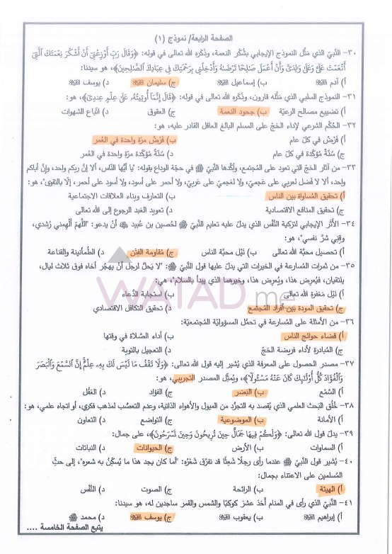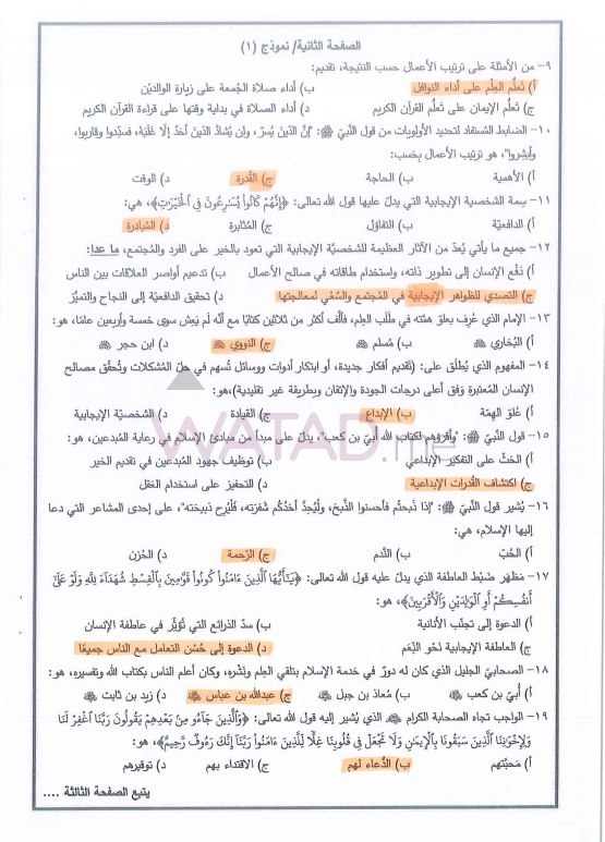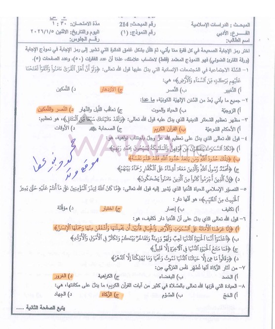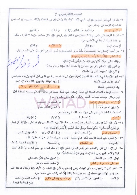 اجابات امتحان الدراسات الاسلامية 2025 التكميلي الاردن